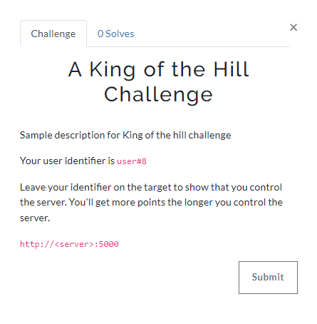 When users view the KoTH challenge, the modal shows the user's identifier and target server/application. In the example below, it's user#8 and http://<server>:5000, respectively.