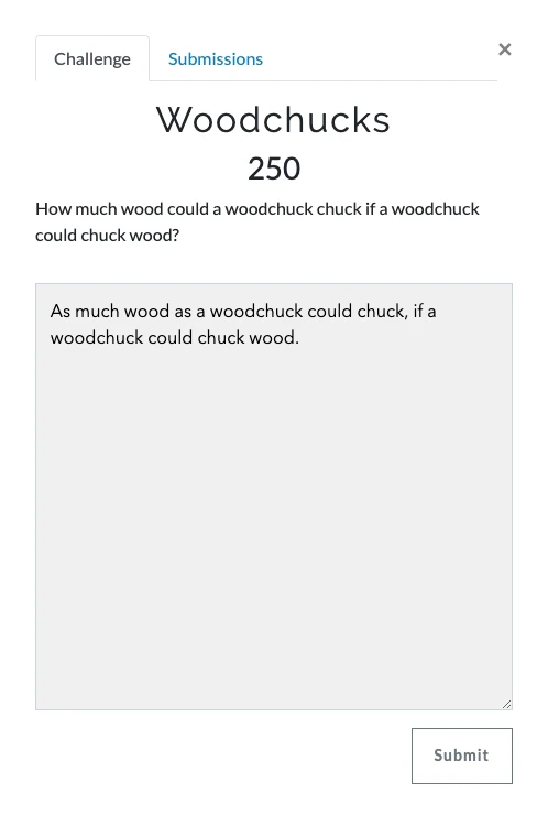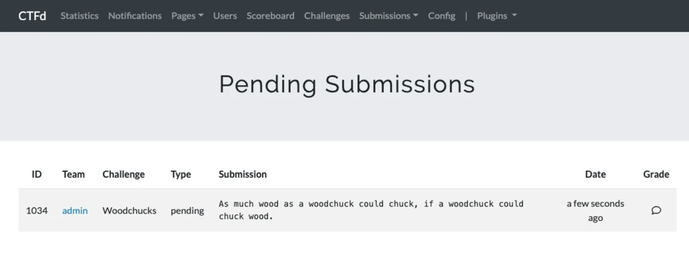 Alternatively, if you wish to award points that are different for each user instead of marking the challenge solved, that is supported in the Manual Verification plugin. However, awards will not prevent the user from submitting more submissions whereas marking the challenge solved means the user cannot submit more to that challenge.