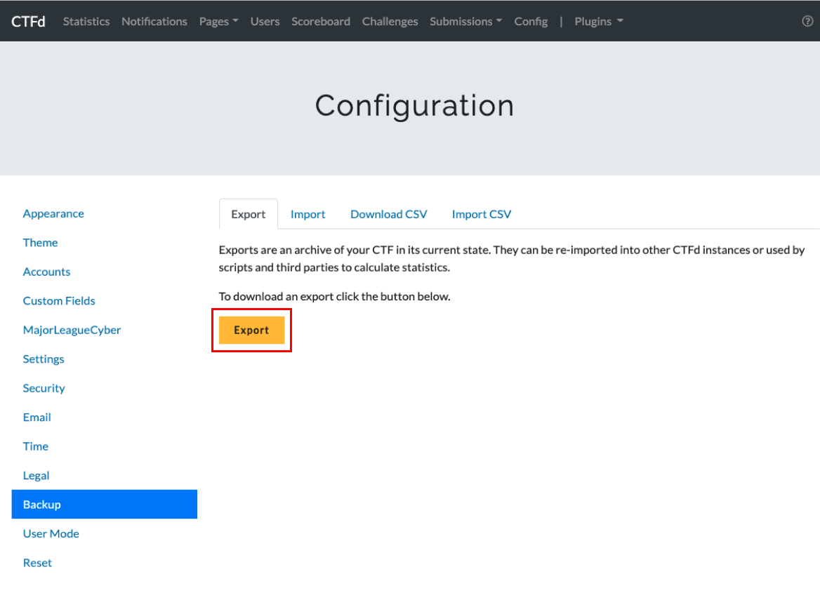 CTFd has the capability to export all instance data as a zip file for archival purposes. This zip file can be imported back into CTFd to restore the instance that was exported. When destroying a hosted CTFd instance, always make sure to create an export as a backup.