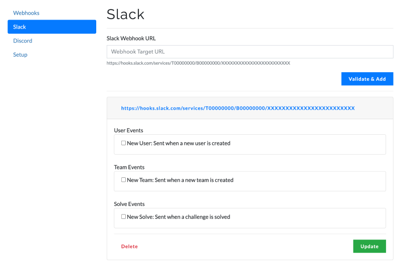 As part of the Webhooks integration, CTFd supports Slack webhooks without any kind of intermediary server or developer setup.