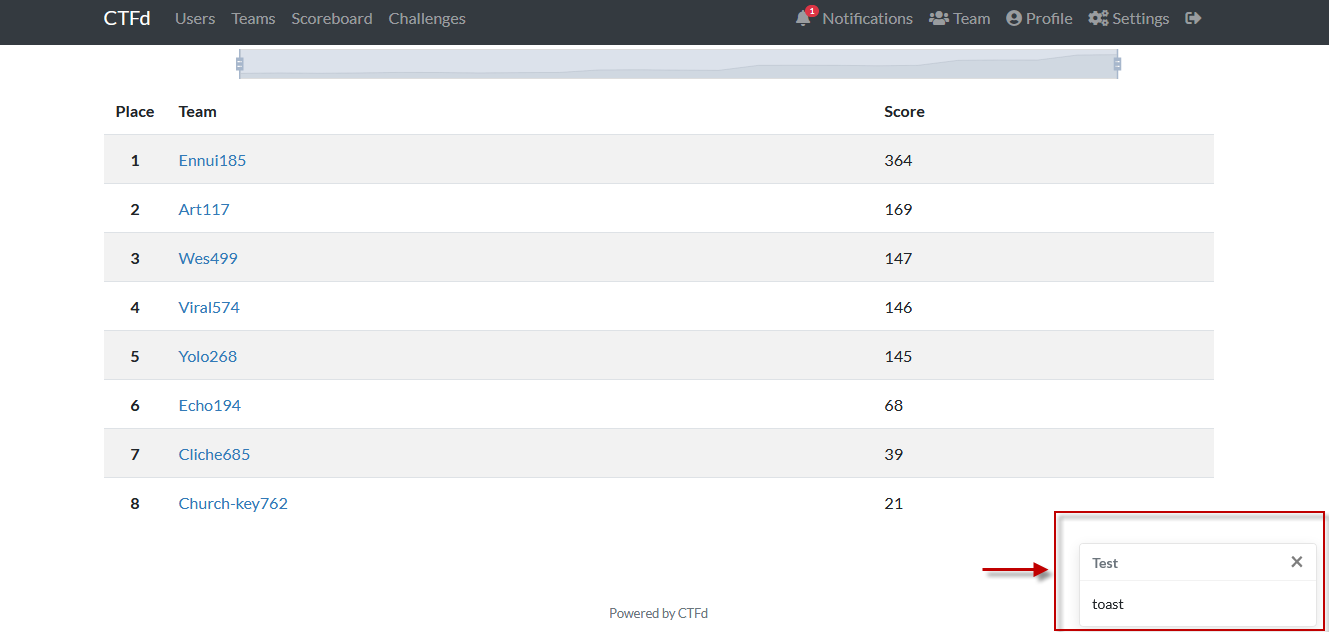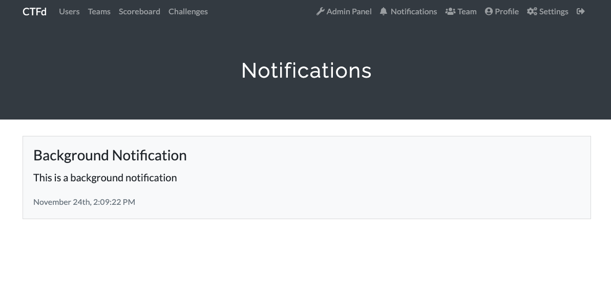 Notifications are a way for event organizers (i.e. Admins) to send out announcements to all connected, all logged-in users in real time. Notifications are only received by users whose browsers have an open CTFd tab.