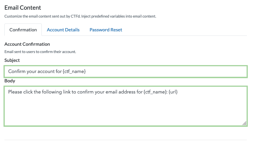 ctf_name- contains the configured name of your CTFd instancectf_description- contains the configured description of your CTFd instanceurl- contains the target URL of the email (e.g. forgot password link, account confirmation link)