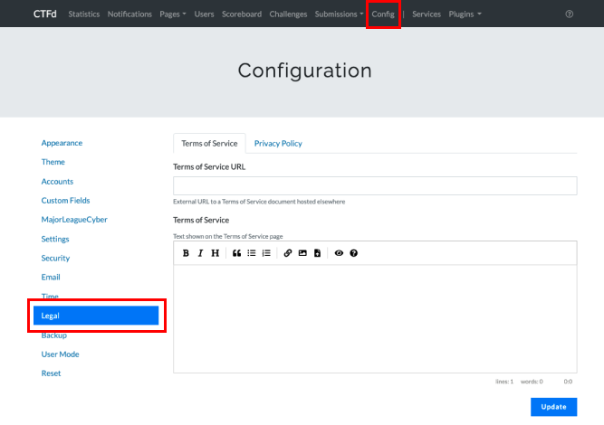 If you provide text for the TOS or Privacy Policy, the text will be available on the CTFd instance at /tos (ie https://demo.ctfd.io/tos) and /privacy (ie https://demo.ctfd.io/privacy) routes respectively. If you provide links for the TOS or Privacy Policy, the /tos and /privacy routes will redirect to the provided links.