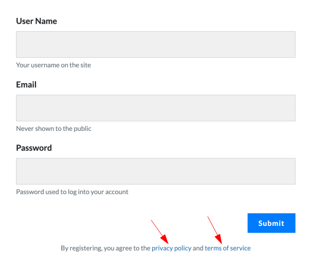 The TOS and/or Privacy Policy will be displayed on the user registration page.