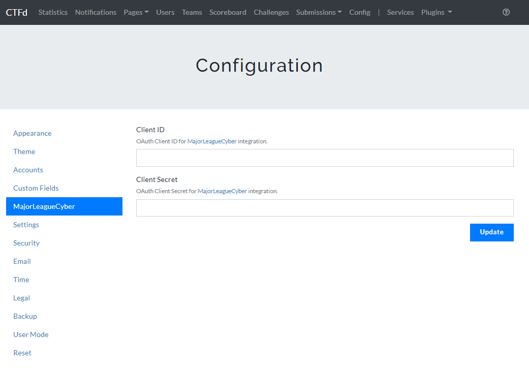 SettingsMajorLeagueCyberMajorLeagueCyberThis section contains the Client ID and Client Secret input fields used to integrate MajorLeagueCyber into CTFd.