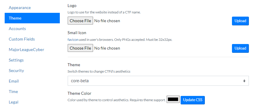 You can also modify an existing theme in your CTFd instance by inserting JavaScript and CSS into the theme's header and footer.