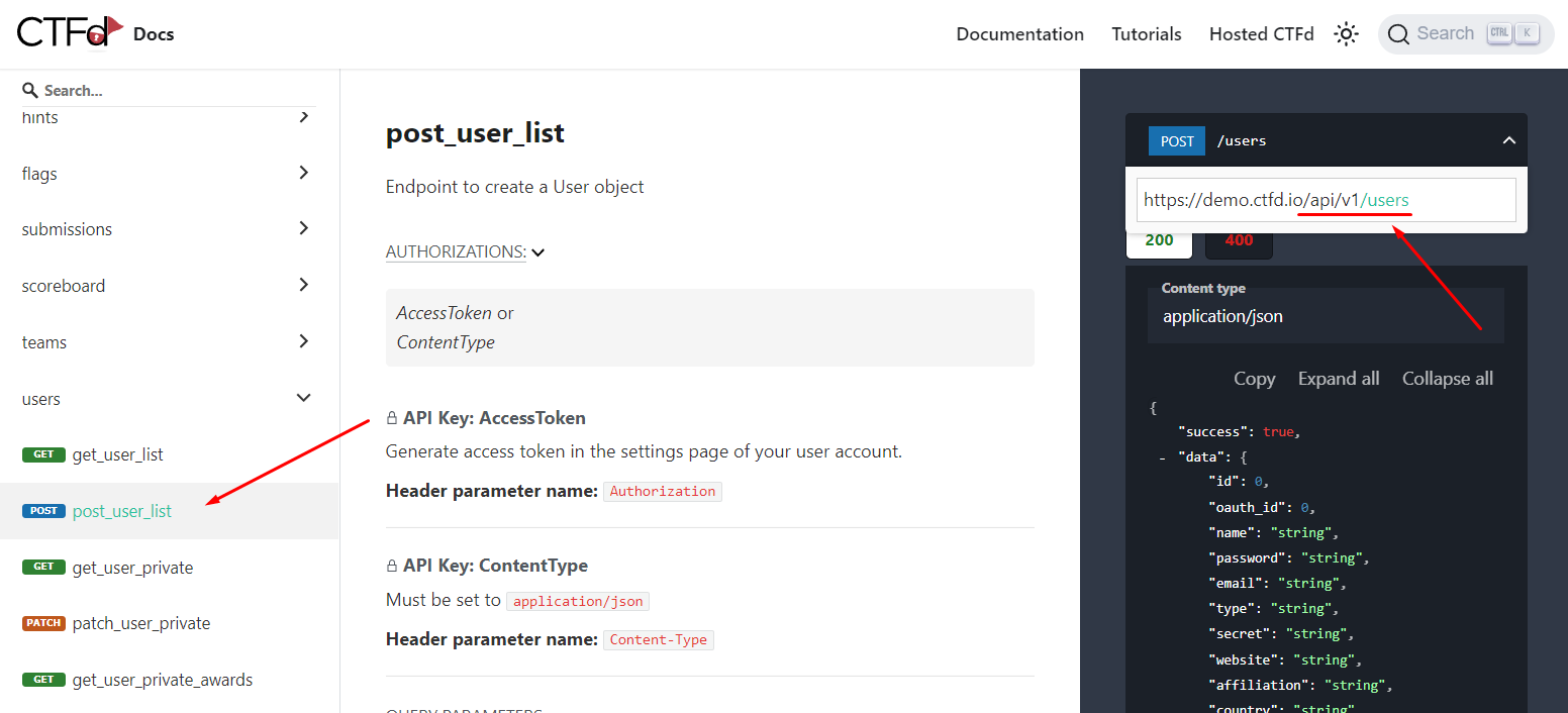 In the API documentation (shown in the picture below), select post_user_list, and take note of its request method and endpoint, which are POST and /api/v1/users, respectively.