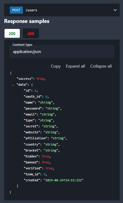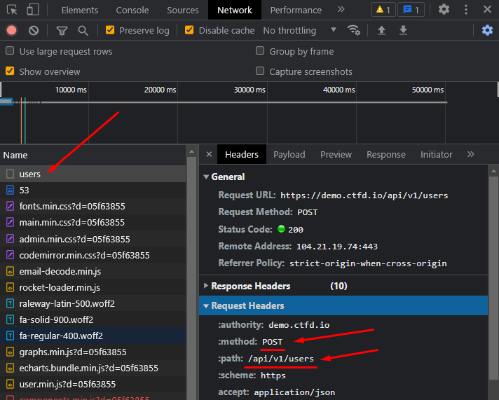 The CTFd API endpoint documentation is still a work in progress. Therefore, to get the appropriate payload structure for the request, you would need to create a new user in CTFd as you normally would. Then, inspect the request made by the CTFd web application using your browser's Developer Tools. To achieve this, do the following: