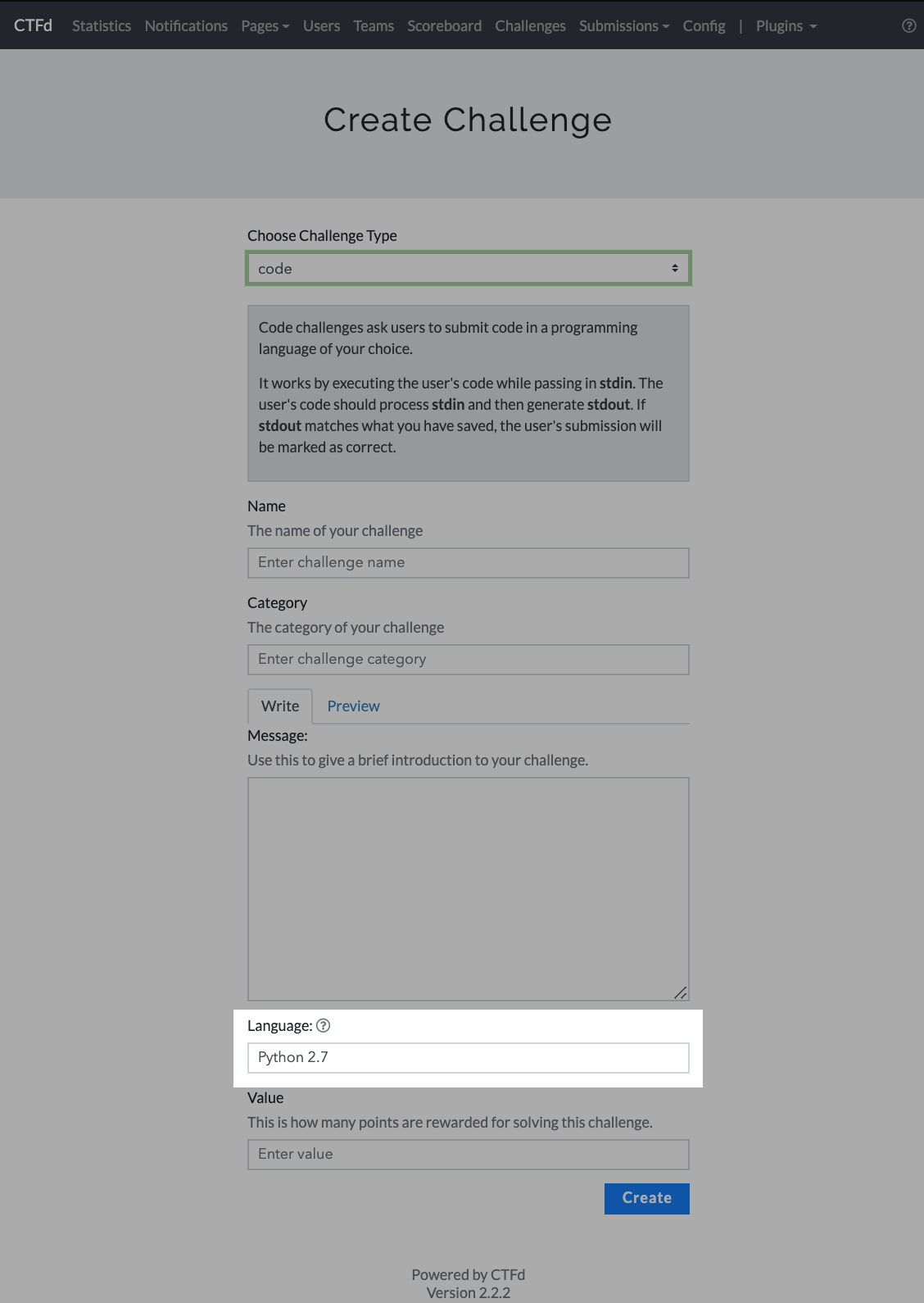 4) Enter the standard values for the challenge, the only different field you need to specify is the language that participants need to use.