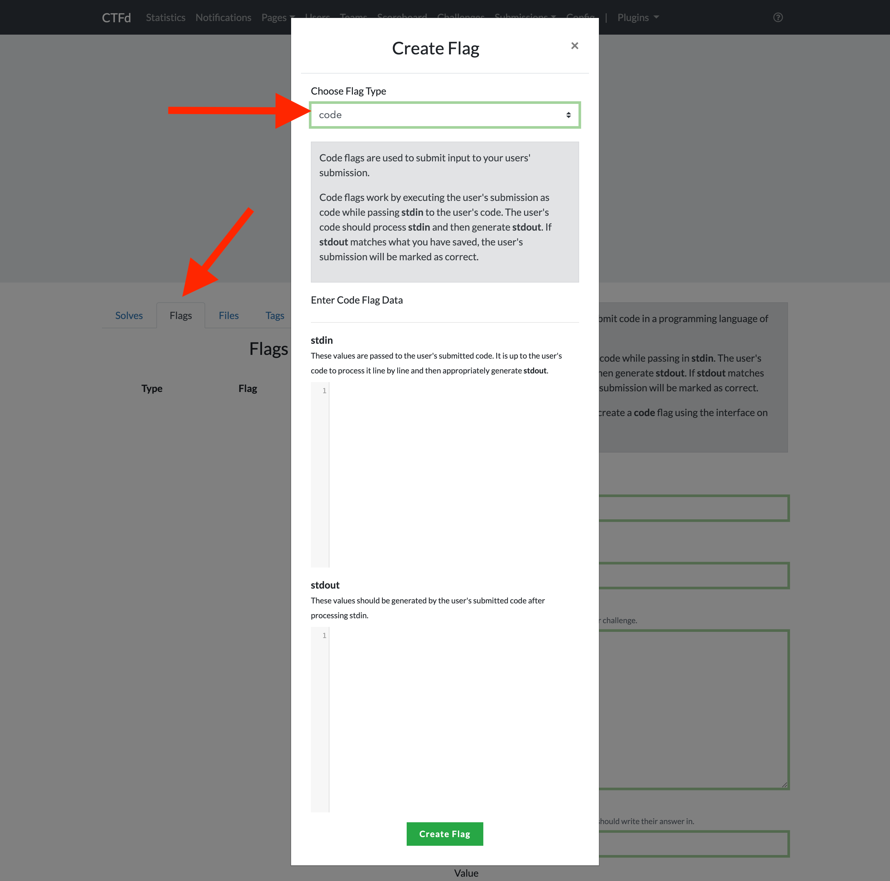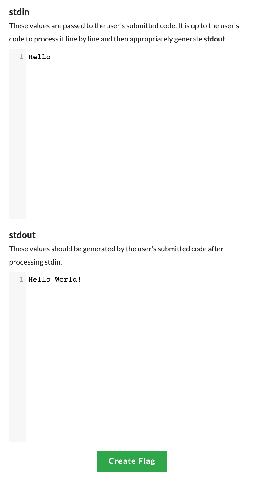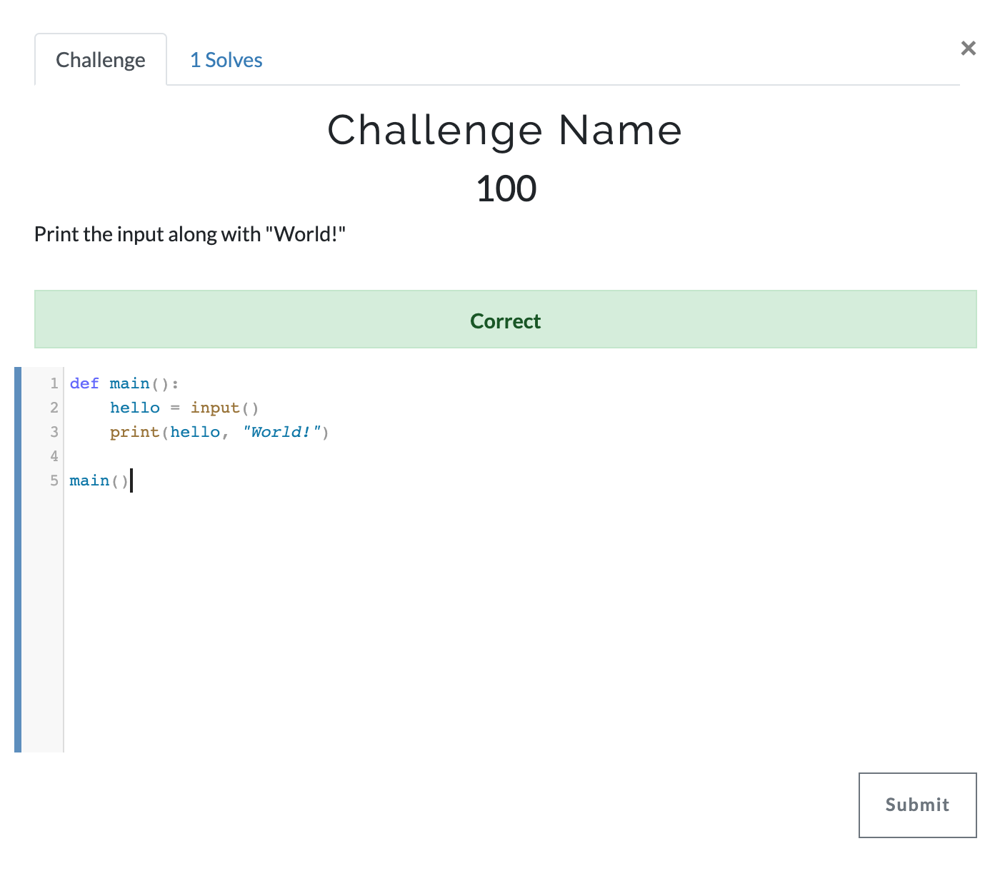 7) Now when the particpant submits the following code, CTFd will execute the code with the parameters and compare it to the set stdout.