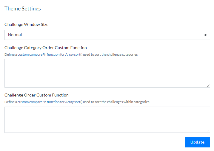 The two boxes in the Theme Settings is where you add a custom JavaScript sort compare function. The first box is for sorting the categories, and the second box is for sorting the challenges within the categories.