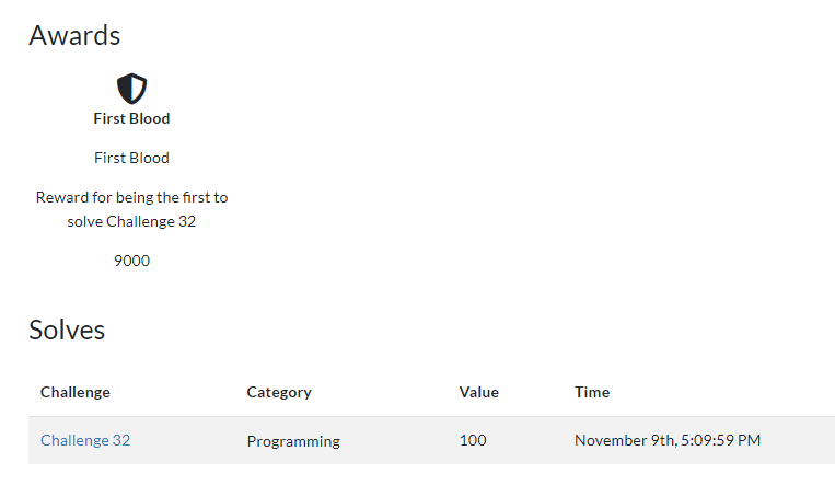 app.pyfile in your code editor and add the highlighted code shown below:app.py# fmt: off# pip install Flask==2.2.2# Set the WEBHOOK_SECRET envvar to your CTFd instance's webhook secretimport hashlibimport hmacimport osimport requestsfrom flask import Flask, jsonify, requestapp = Flask(__name__)@app.route('/', methods=["GET", "POST"])def verify(): if request.method == "GET": key = os.environ["WEBHOOK_SECRET"] token = request.args.get("token") response = hmac.new( key=key.encode(), msg=token.encode(), digestmod=hashlib.sha256 ).hexdigest() return jsonify({ "response": response, }) elif request.method == "POST": token = os.environ["API_TOKEN"] url = os.environ["BASE_URL"] url = url.strip("/") payload = request.json s = requests.Session() s.headers.update({"Authorization": f"Token {token}", "Content-type":"application/json"}) submission = s.get(f"{url}/api/v1/submissions/{payload['id']}", json=True).json() r = s.post( f"{url}/api/v1/awards", json={ "name": "First Blood", "value": "9000", "category": "First Blood", "description": f"Reward for being the first to solve {submission['data']['challenge']['name']}", "icon":"shield", "user_id": f"{submission['data']['user']['id']}" }, timeout=10, ) print(request.url) print(request.headers) print(request.json) return "", 200if __name__ == "__main__": app.run(debug=True, threaded=True, host="127.0.0.1", port=12345)