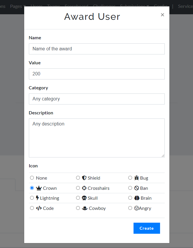 Enter the details for the award. All of the details are optional except for the Value. Once done, click Create.