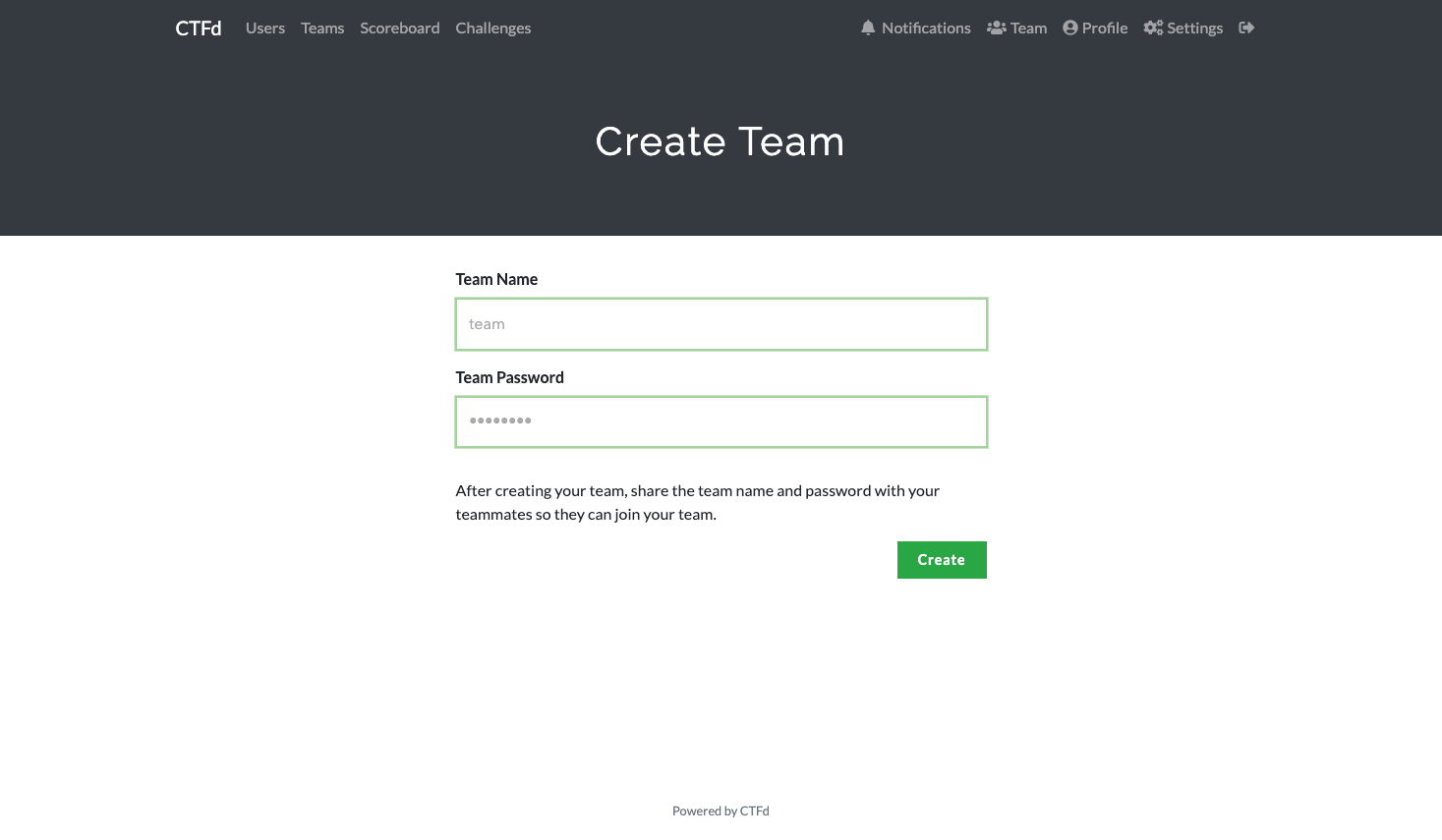 Team Creation is only enabled if CTFd is in Teams Mode.